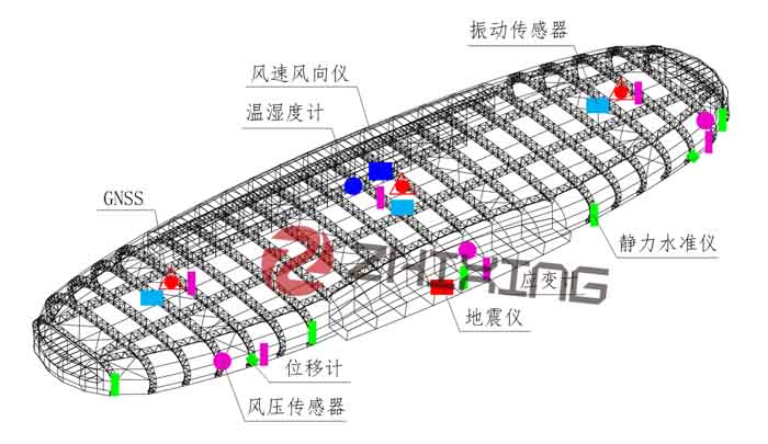 大跨空間結(jié)構(gòu)主要監(jiān)測(cè)內(nèi)容:風(fēng)速風(fēng)向、風(fēng)壓、環(huán)境溫濕度、水平豎向變形、基礎(chǔ)沉降、支座位移、地震、結(jié)構(gòu)振動(dòng)、結(jié)構(gòu)應(yīng)變