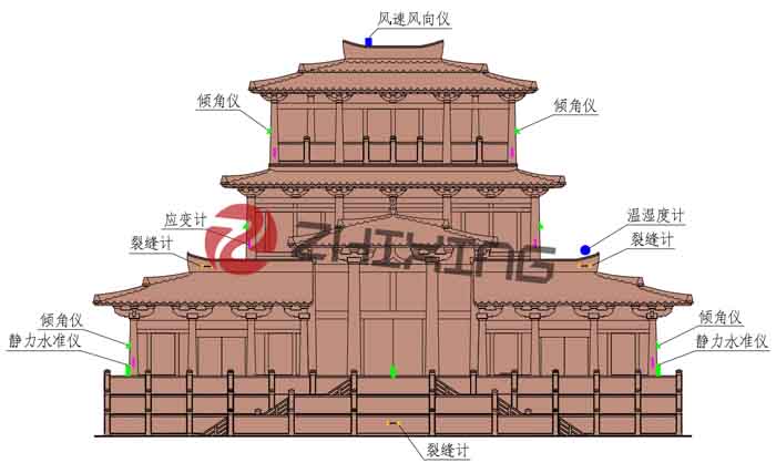 文保建筑主要監(jiān)測(cè)內(nèi)容:風(fēng)速風(fēng)向、環(huán)境溫濕度、裂縫、沉降、傾斜、結(jié)構(gòu)應(yīng)變