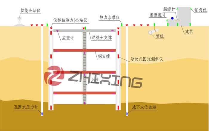 深基坑主要監(jiān)測(cè)內(nèi)容:支護(hù)樁墻位移、支護(hù)樁墻深部位移、支撐內(nèi)力、周邊地表沉降、周邊管線變形、立柱沉降、地下水位、周邊建筑沉降傾斜、周邊建筑地表裂縫